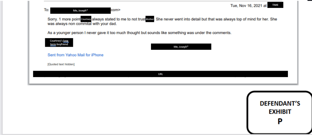 The email was damning to Mother’s social credit. It says that my dead sister did not trust her own Mother. This was great evidence for my case. My Mother and Father attempted to discredit the email by stating it was from “an acquaintance”. Lie. Shortly after the court case I received this line in an email from Courtney’s ex-boyfriend: