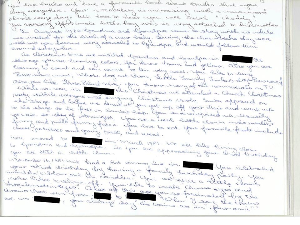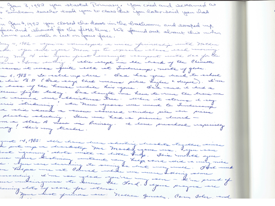 Mother made six entries of decreasing length. The first was the story of my birth, and how hard it was on her. The last, when I was 4, was documenting an injury.