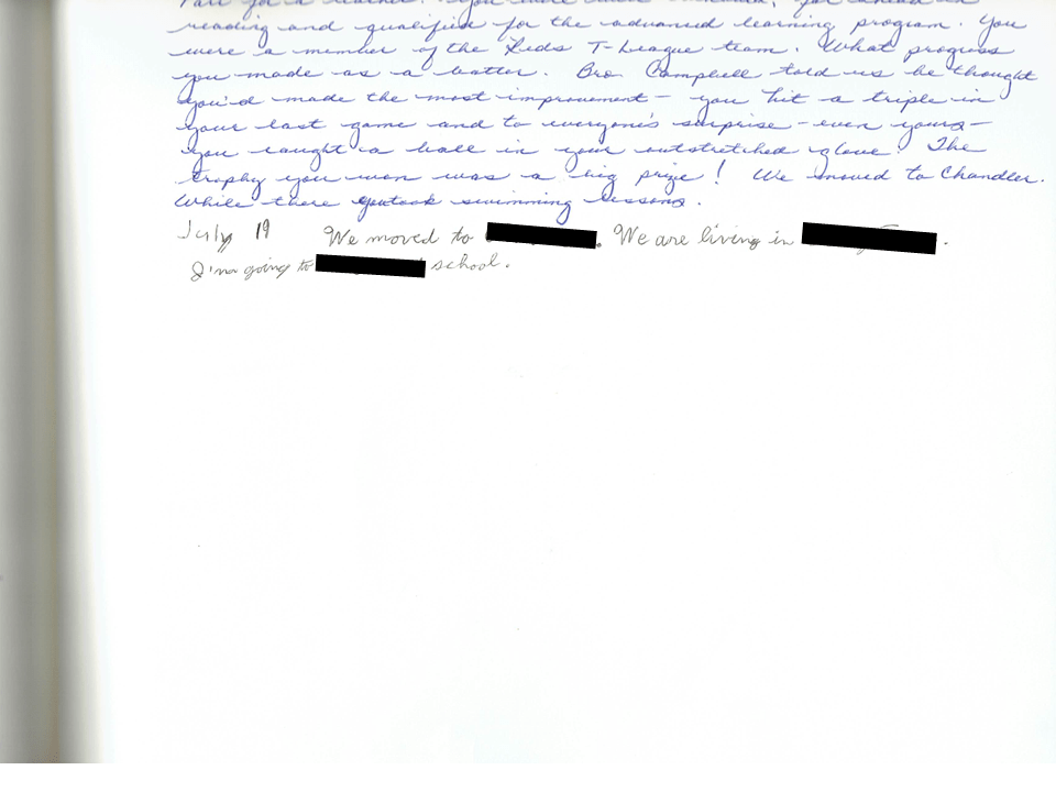 We moved to (city redacted). We are living in (town redacted). I’m going to (school redacted).