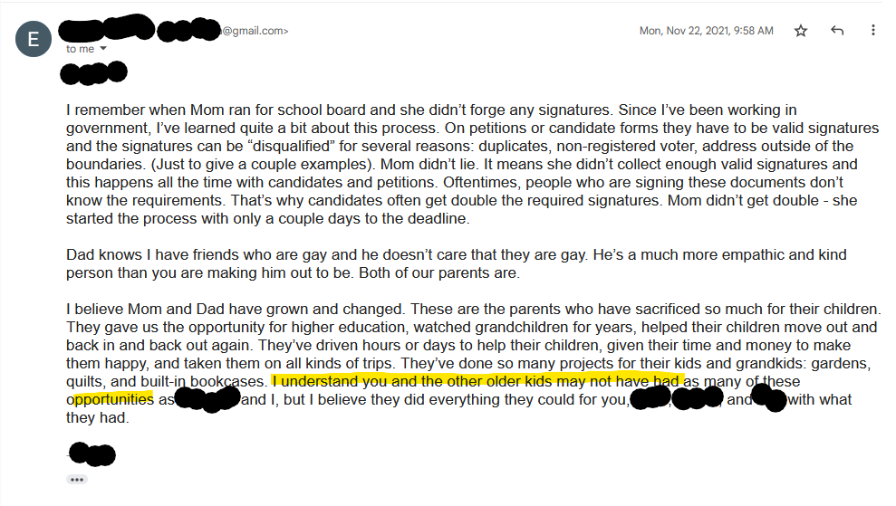 I like that she listed that our “parents…given their time and money…”. Did she talk to Mother before she wrote that? When I was kicked out at age 18 Mother handed me an Index Card. on that card was a list of all the money she had spent on me from ages 10(?) to 18. it was about $6000. Mother asked me for the money.