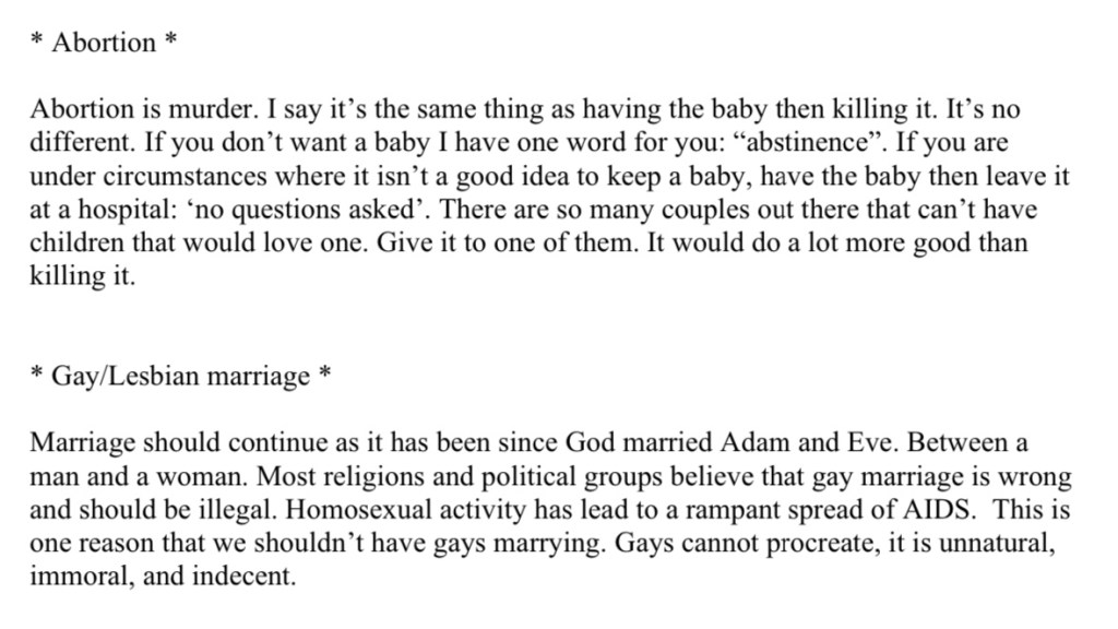 Also, Karen lies about our Father’s views on LGBTQIA+. On January 16, 2021 Father stated explicitly that “all homosexuals should be put on an island to kill each other with disease”. That is the second time in my life I heard him say that exact phrase.